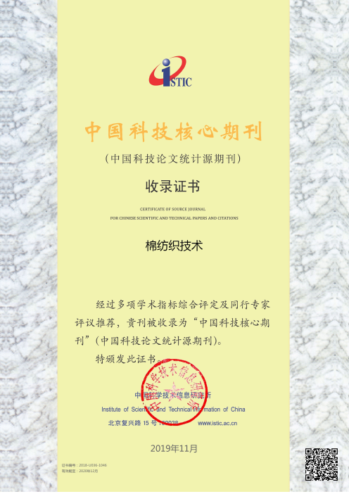 11月19日,“2019年中国科技论文统计结果发布会·卓越论坛”公布2019年版中国科技核心期刊名录,《棉纺织技术》期刊再次入选《中国科技核心期刊》。