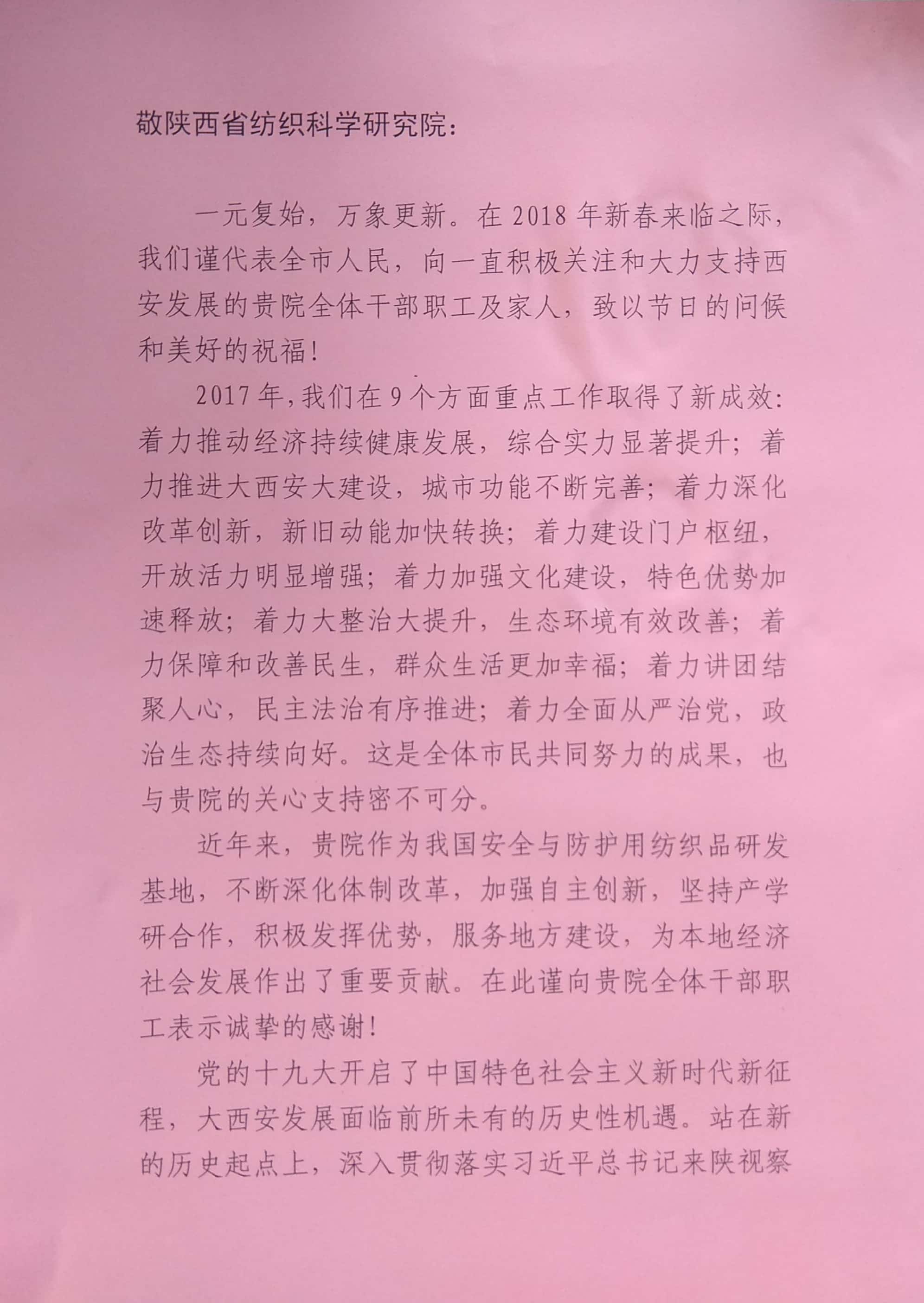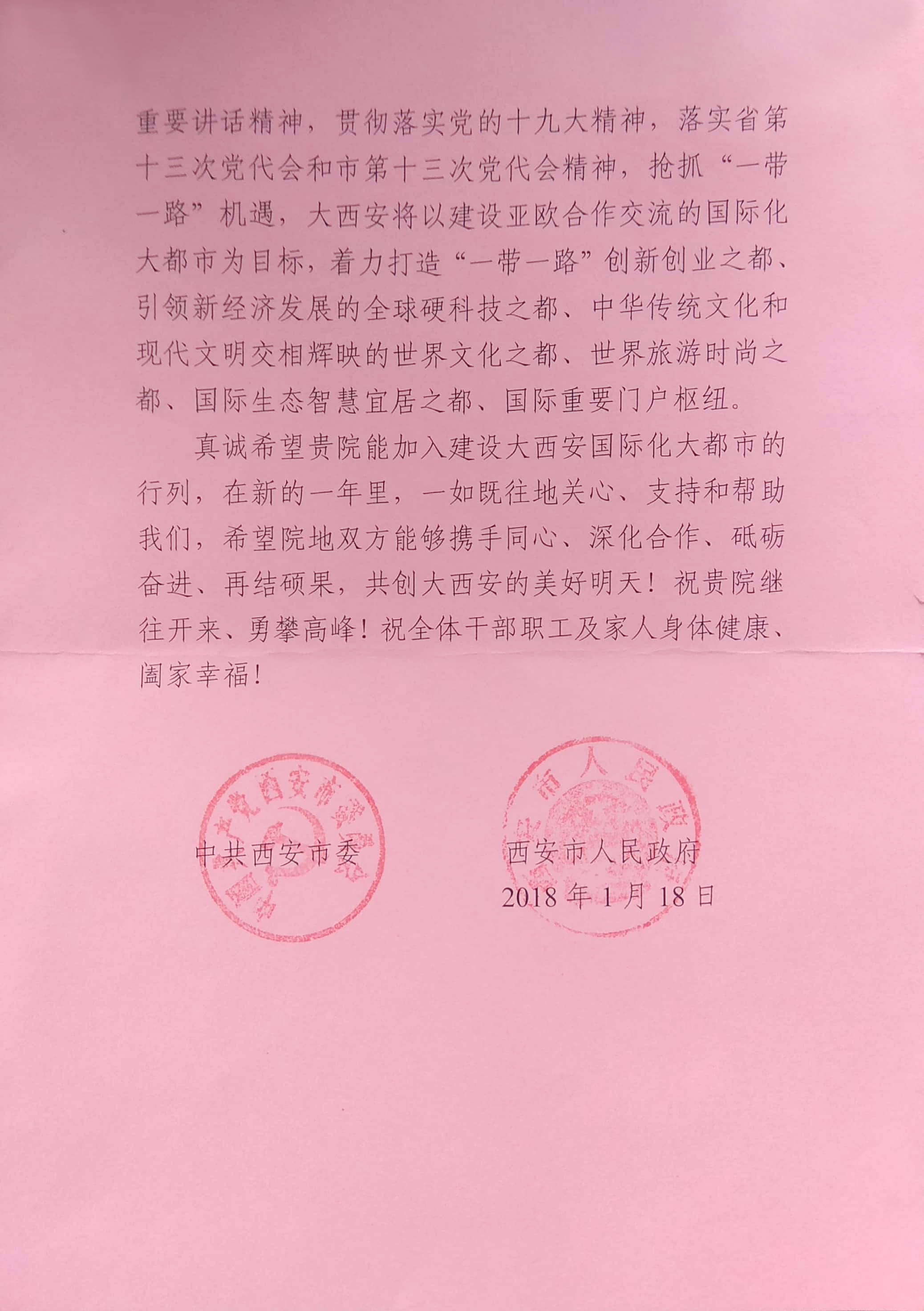 2月6日,西安市人大领导代表西安市市委、市政府为我院送来新春贺信, 向一直积极关注和大力支持地方发展的我院全体干部职工及家人,送来了节日的问候和美好的祝福!